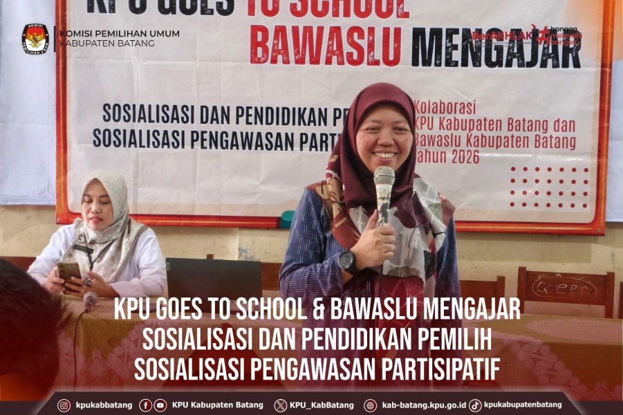 #TemanPemilih, Rabu (4 Februari 2026) KPU Kabupaten Batang melaksanakan KPU Goes To School & Bawaslu Mengajar Sosialisasi dan Pendidikan Pemilih Sosialisasi Pengawasan Partisipatif. Sosialisasi dilaksanakan di SMK NU Tulis Kabupaten Batang kegiatan ini diselenggarakan oleh KPU Kabupaten Batang yang Berkaloborasi dengan Bawaslu Kabupaten Batang yang bertujuan untuk memberikan edukasi tentang Pendidikan Politik, Demokrasi, Pemilu dan Pemilihan bagi Pemilih Pemula.