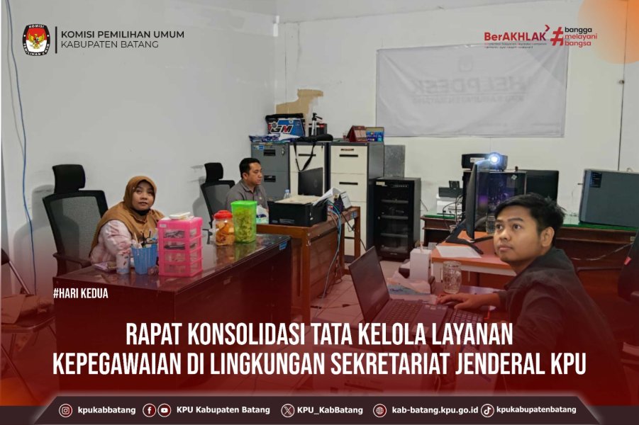 #TemanPemilih, Sabtu (13 September 2025) KPU Kabupaten Batang mengikuti Rapat Konsolidasi Hari Kedua Layanan Tata Kelola Kepegawaian dengan BKN di lingkungan Sekretariat Jenderal KPU Tahun 2025, yang diadakan oleh KPU RI secara daring melalui zoom.