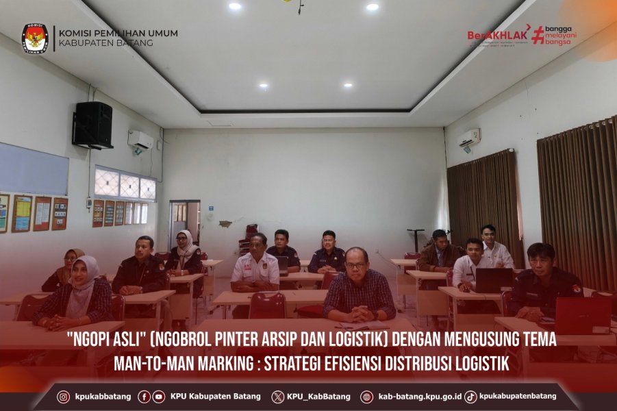 #TemanPemilih, Selasa (18 November 2025) KPU Kabupaten Batang mengikuti kegiatan "NGOPI ASLI" (Ngobrol Pinter Arsip dan Logistik dengan topik Man-to-Man Marking : Strategi Efisiensi Distribusi Logistik. Kegiatan diikuti oleh jajaran Komisioner dan Sekretariat KPU Kabupaten Batang.