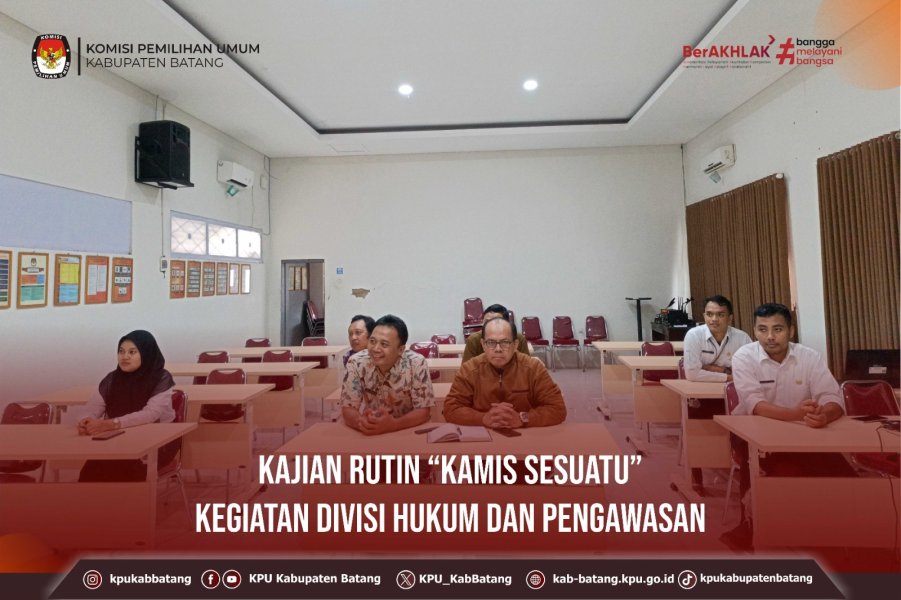 #TemanPemilih, Jumat (21 November 2025) KPU Kabupaten Batang mengikuti kegiatan Kajian Rutin Kamis Sesuatu Seri ke XXVIII Divisi Hukum dan Pengawasan Tahun 2025 dengan Putusan Perkara Nomor 304/PHPU.GUB-XIII/2025 Gunernur dan Wakil Gubernur Papua Tahun 2024, yang diselenggarakan oleh KPU Provinsi Jawa Tengah. Kegiatan diikuti oleh Ketua Divisi Hukum dan Pengawasan Tarwandi KPU Kabupaten Batang, Sekretaris, Kasubbag TPPH beserta Staf TPP KPU Kabupaten Batang.