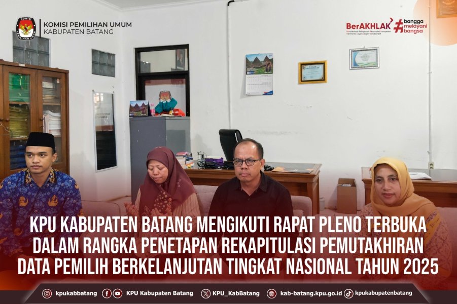 #TemanPemilih, Rabu (17 Desember 2025) KPU Kabupaten Batang mengikuti Rapat Pleno Terbuka dalam rangka Penetapan Rekapitulasi Pemutakhiran Data Pemilih Berkelanjutan (PDPB) Tingkat Nasional Tahun 2025, di Kantor KPU Kabupaten Batang, kegiatan ini diadakan oleh KPU RI secara daring melalui zoom.