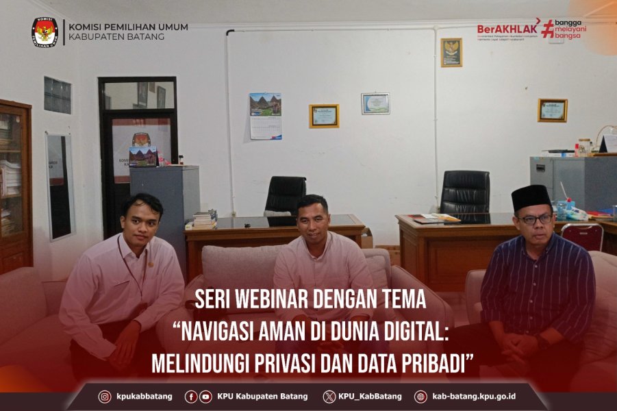 #TemanPemilih, Jumat (19 Desember 2025) KPU Kabupaten Batang mengikuti Seri Webinar dengan tema "Navigasi Aman di Dunia Digital: Melindungi Privasi dan Data Pribadi", kegiatan ini diadakan oleh KPU RI secara daring melalui zoom.