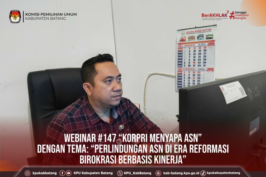 #TemanPemilih, Kamis (5 Februari 2026) KPU Kabupaten Batang mengikuti kegiatan Seri Webinar #147 “KORPRI MENYAPA ASN” dengan Tema: “Perlindungan ASN di Era Reformasi Birokrasi Berbasis Kinerja” secara daring melalui zoom.