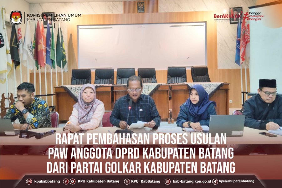 #TemanPemilih, Senin (23 Februari 2026) KPU Kabupaten Batang melaksanakan Rapat Pembahasan Proses Usulan PAW Anggota DPRD Kabupaten Batang dari Partai Golkar Kabupaten Batang. Kegiatan diikuti oleh jajaran Komisioner, Sekretaris, Kasubbag dan Staf TPPH KPU Kabupaten Batang.
