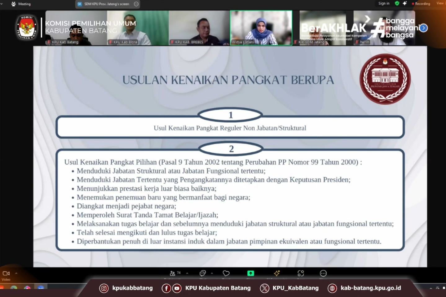 #TemanPemilih, Kamis (7 Agustus 2025) KPU Kabupaten Batang mengikuti Sosialisasi Prosedur Kenaikan Pangkat PNS Di Lingkungan KPU Provinsi dan KPU Kabupaten/Kota yang diadakan oleh KPU Provinsi Jawa Tengah secara daring melalui zoom.