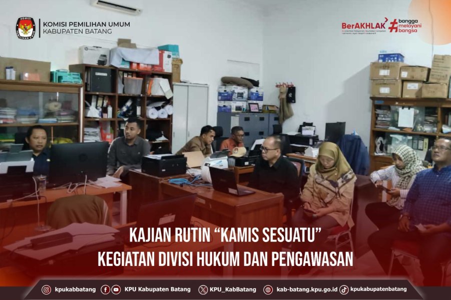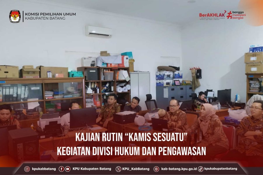 #TemanPemilih, Kamis (18 September 2025) KPU Kabupaten Batang mengikuti kegiatan Kajian Rutin Kamis Sesuatu Seri ke XIX Divisi Hukum dan Pengawasan Tahun 2025 dengan Putusan Perkara Nomor 70/PHPU.BUP-XXIII/2025 PHPU Bupati dan Wakil Bupati Serang Tahun 2024, yang diselenggarakan oleh KPU Provinsi Jawa Tengah. Kegiatan diikuti oleh Ketua Divisi Hukum dan Pengawasan Tarwandi KPU Kabupaten Batang, Sekretaris, Kasubbag TPPH beserta Staf TPP KPU Kabupaten Batang.