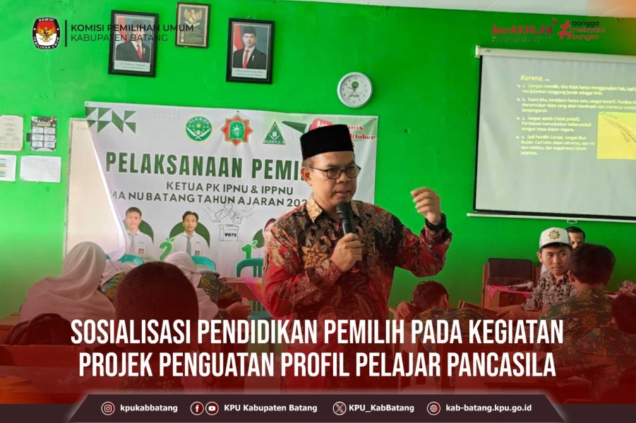 Batang, 1 Oktober 2025 – Komisi Pemilihan Umum (KPU) Kabupaten Batang melalui Divisi Hukum melaksanakan Sosialisasi Pendidikan Pemilih pada kegiatan Projek Penguatan Profil Pelajar Pancasila (P5) di MANU Batang, Rabu (1/10) pukul 08.00 WIB. Hadir sebagai narasumber Tarwandi, Anggota KPU Kabupaten Batang Divisi Hukum. Kegiatan ini merupakan bagian dari upaya KPU untuk menanamkan kesadaran berdemokrasi sejak dini kepada generasi muda, khususnya para pelajar, agar memahami pentingnya partisipasi dalam Pemilu maupun kehidupan demokrasi di Indonesia. Melalui kegiatan ini, diharapkan para siswa MANU Batang dapat menjadi pemilih yang cerdas, kritis, serta berintegritas, sekaligus mencerminkan nilai-nilai Profil Pelajar Pancasila dalam kehidupan sehari-hari.