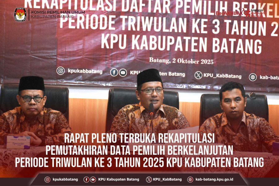 #TemanPemilih, 2 Oktober 2025 – Komisi Pemilihan Umum (KPU) Kabupaten Batang menyelenggarakan Rapat Pleno Pemutakhiran Data Pemilih Berkelanjutan (PDPB) Triwulan III Tahun 2025 pada Kamis (2/10) bertempat di Aula Kantor KPU Kabupaten Batang. Rapat pleno ini dihadiri oleh seluruh Komisioner KPU Kabupaten Batang, Sekretaris beserta jajaran sekretariat, perwakilan Bawaslu Kabupaten Batang, Disdukcapil Kabupaten Batang, Partai Politik, serta unsur terkait lainnya. Ketua KPU Kabupaten Batang Susanto Waluyo, dalam sambutannya menegaskan bahwa kegiatan PDPB merupakan amanat Undang-Undang untuk memastikan kualitas daftar pemilih tetap terjaga, akurat, dan mutakhir. “Pemutakhiran data pemilih dilakukan secara berkelanjutan agar pada saat tahapan Pemilu maupun Pemilihan nanti, daftar pemilih yang ditetapkan benar-benar valid, komprehensif, dan akuntabel,” ujarnya. Dalam rapat pleno, KPU Kabupaten Batang memaparkan rekapitulasi hasil pemutakhiran data pemilih periode Triwulan 3 Tahun 2025 yang mencakup pemilih baru, pemilih yang tidak memenuhi syarat (TMS), serta pemilih yang melakukan perbaikan data. Data tersebut diperoleh dari hasil koordinasi dengan Disdukcapil, laporan masyarakat, serta tindak lanjut hasil pengawasan Bawaslu. Hasil rapat pleno PDPB Periode Triwulan III Tahun 2025 akan diumumkan secara terbuka melalui papan pengumuman di kantor KPU Kabupaten Batang, laman resmi, serta kanal media sosial KPU, agar masyarakat dapat memberikan masukan maupun tanggapan terhadap data yang telah diplenokan. KPU Kabupaten Batang berharap masyarakat terus proaktif dalam memastikan hak pilihnya, dengan melaporkan jika ada perubahan status kependudukan seperti pindah domisili, meninggal dunia, perubahan status TNI/Polri, atau perubahan data identitas lainnya.