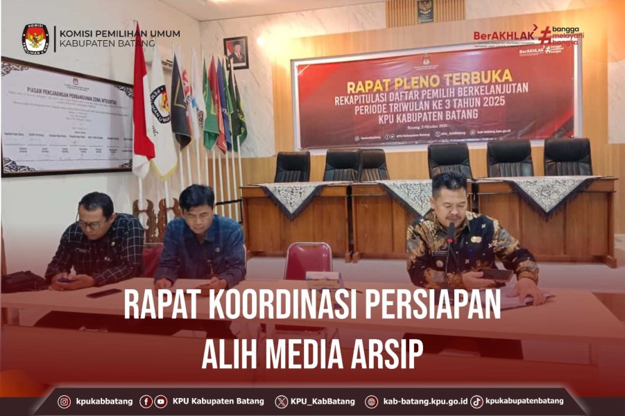 #TemanPemilih, Kamis (02 Oktober 2025) KPU Kabupaten Batang menggelar Rapat Koordinasi Persiapan Alih Media Arsip yang berlangsung di Aula Kantor KPU Kabupaten Batang. Kegiatan ini diikuti oleh seluruh jajaran sekretariat KPU Kabupaten Batang. Rapat dipimpin oleh Sekretaris KPU Kabupaten Batang, Murtadho dengan agenda utama membahas langkah-langkah teknis dan strategi pelaksanaan alih media arsip sebagai bagian dari upaya modernisasi dan digitalisasi tata kelola kearsipan.