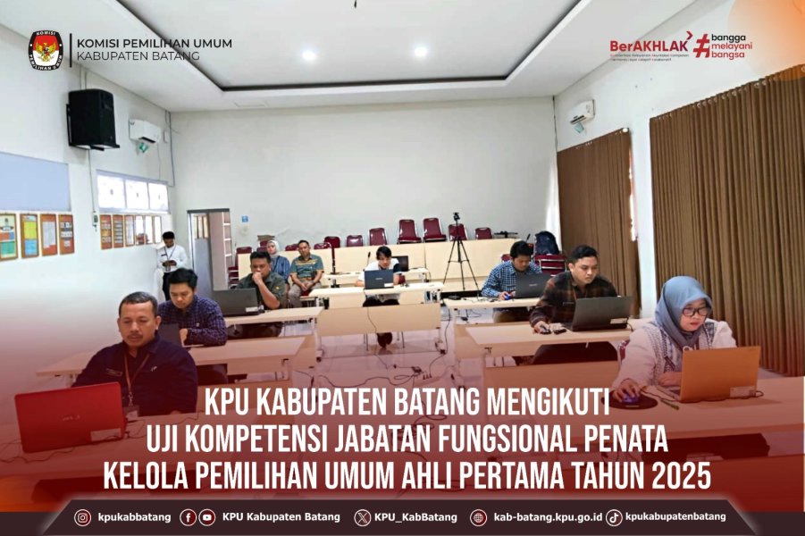 #TemanPemilih, Kamis (30 Oktober 2025) KPU Kabupaten Batang Mengikuti Uji Kompetensi Jabatan Fungsional Penata Kelola Pemilihan Umum Ahli Pertama Tahun 2025. yang diadakan oleh KPU RI secara daring melalui zoom. Peserta dari KPU Kabupaten Batang Ismu Wijayanto, Nanda Rofiq Kurniawan, Wachid Nur Zidiq, Siswanto, Titis Puji Mulyani, Abdul Latif, Muhamad Misuari Somayaji.