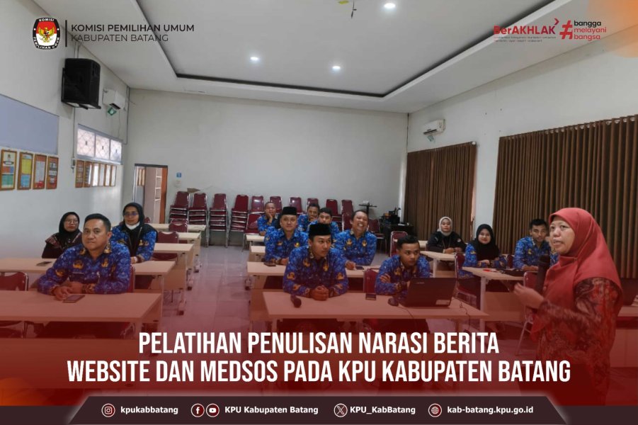 #temanpemilih, Batang, 1 Oktober 2025 Komisi Pemilihan Umum (KPU) Kabupaten Batang menyelenggarakan kegiatan Pelatihan Menulis Website dan Media Sosial pada Rabu, 1 Oktober 2025 bertempat di Aula KPU Kabupaten Batang. Acara dimulai pukul 09.30 WIB dan diikuti oleh 34 peserta yang terdiri dari Komisioner KPU dan jajaran Sekretariat. Pelatihan ini dilaksanakan dalam rangka meningkatkan kapasitas pegawai, khususnya dalam keterampilan penulisan berita dan konten yang akan dipublikasikan melalui website maupun media sosial KPU Kabupaten Batang. Urgensi kegiatan ini didasarkan pada kebutuhan peningkatan kemampuan pegawai dalam mengelola informasi publik secara efektif dan berkualitas. Melalui kegiatan ini, KPU Kabupaten Batang berkomitmen untuk terus menjaga kualitas informasi publik yang disampaikan melalui kanal resmi, baik website maupun media sosial, sehingga masyarakat dapat memperoleh informasi yang akurat, transparan, dan terpercaya.
