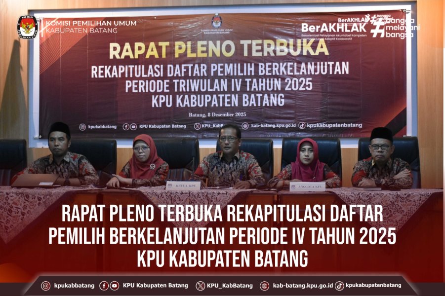 #TemanPemilih, Senin 8 Desember 2025 KPU Kabupaten Batang menyelenggarakan Rapat Pleno Pemutakhiran Data Pemilih Berkelanjutan (PDPB) Triwulan IV Tahun 2025 bertempat di Aula Kantor KPU Kabupaten Batang.
