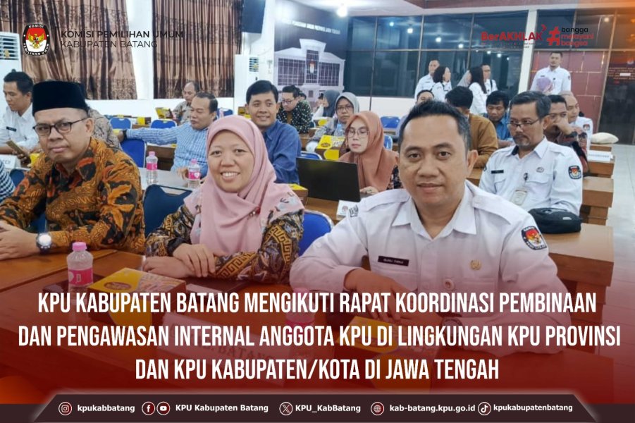 #TemanPemilih, Kamis (4 Desember 2025) KPU Kabupaten Batang Mengikuti Rapat Koordinasi Pembinaan Dan Pengawasan Internal Anggota Kpu di lingkungan KPU provinsi dan KPU Kabupaten/Kota di Jawa Tengah, kegiatan ini diadakan oleh KPU Provinsi Jawa Tengah bertempat di Aula KPU Provinsi Jawa Tengah.