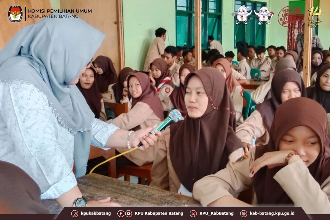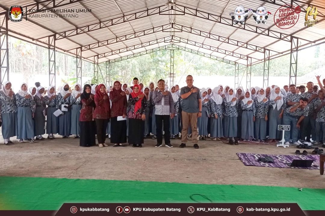 #TemanPemilih, Rabu (18/10) Ketua KPU Kabupaten Batang Nur Tofan memberikan materi Pendidikan Pemilih dan Sosialisasi Tahapan Pemilu 2024 kepada pelajar SMA Negeri 1 Wonotunggal melalui Projek Penguatan Profil Pelajar Pancasila (P5) dengan tema “Suaraku Ekspresiku” Pendidikan Pemilih dan Sosialisasi yang bertempat di Aula terbuka SMA Ngeri 1 Wonotunggal diikuti oleh 200 an siswa siswi Kelas 11, dari 200 an siswa siswi yang mengikuti terdapat 62 siswa siswi yang pada tanggal 14 Februai 2024 sudah berumur 17 tahun. Nur Tofan menyampaikan materi tentang demokrasi dan kepemiluan, kegiatan ini sebagai bekal dalam rangka memahami tentang kepemiluan dan dapat diterapkan pada pelaksanaan pilketos di SMA Negeri 1 Wonotunggal. Ketika melaksanakan pemilihan ketua OSIS (PILKETOS) itu berarti sama dengan telah belajar menjalankan proses demokratisasi yang ada di negara ini tuturnya. Nur Tofan juga menyampaikan agar mengecek namanya sudah terdaftar di DPT Pemilu 2024 atau belum bagi siswa/i yang sudah punya hak pilih pada pemilu 2024 melalui https://cekdptonline.kpu.go.id, juga dapat mengunjungi website KPU Kabupaten Batang http://kab-batang.kpu.go.id untuk mengetahui informasi tentang kepemiluan. KPU Kabupaten Batang mengharapkan pada saat pemilu nanti dalam proses - proses yang melibatkan publik, benar - benar memberikan harapan sekaligus menarik simpatik dikalangan generasi milenial yang akan memilih untuk pertama kali, Siswa/i ada rasa kepekaan terhadap pemilu serentak yang akan memilih calon presiden dan wakil presiden, anggota DPR, DPD, dan DPRD Kabupaten/Kota tersebut. #KPUMelayani #PemilihSerentak2024 #PemiluSaranaIntegrasiBangsa