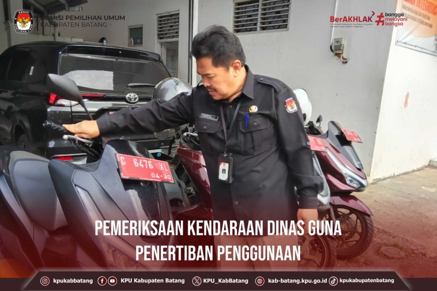 #TemanPemilih, Rabu (4 Maret 2026) KPU Kabupaten Batang melaksanakan Pemeriksaan Kendaraan Dinas Guna Penertiban Penggunaan. Pemeriksaan dilaksanakan oleh Sekretaris, Kasubbag Keuangan Umum dan Logistik, Petugas BMN KPU Kabupaten Batang, bertempat di Halaman Kantor KPU Kabupaten Batang.
