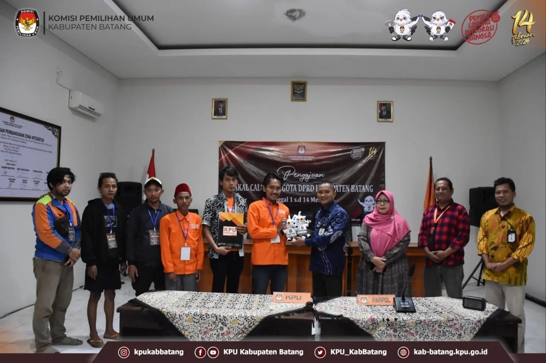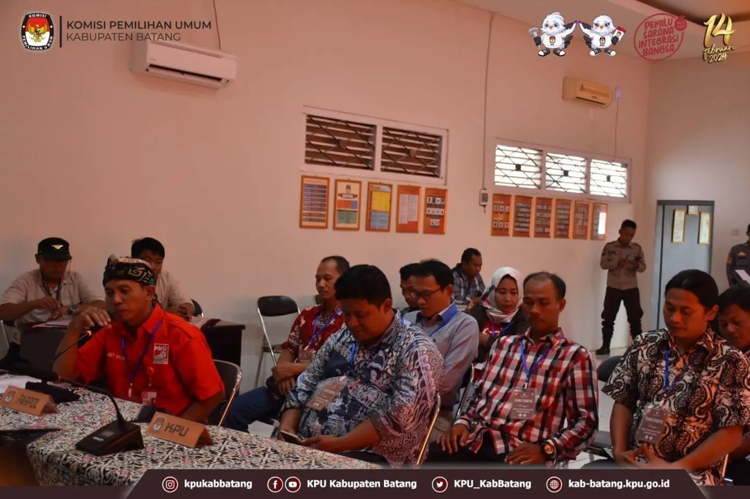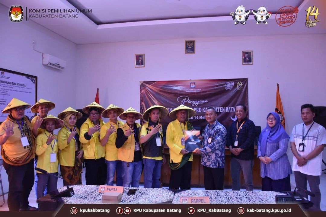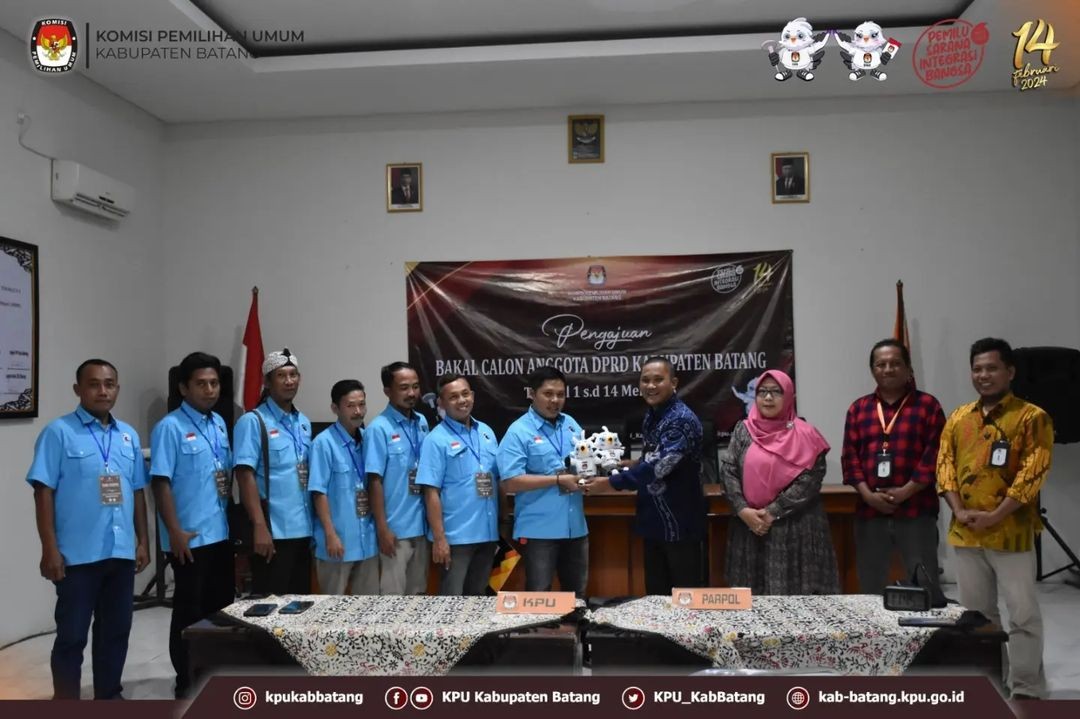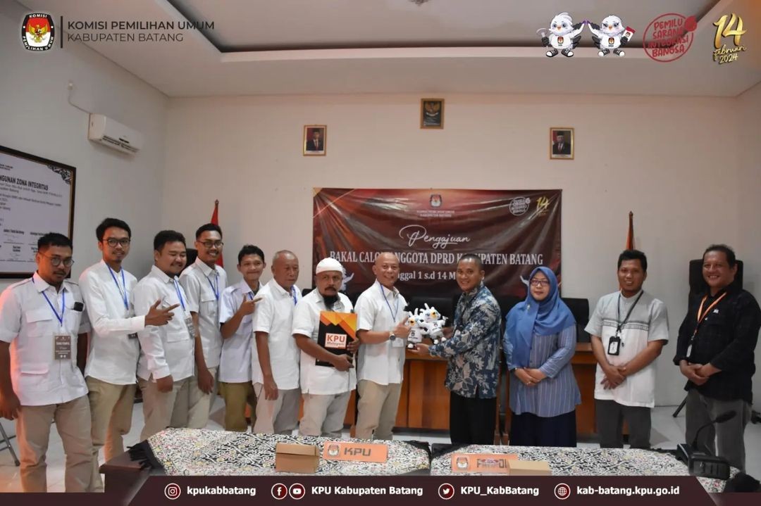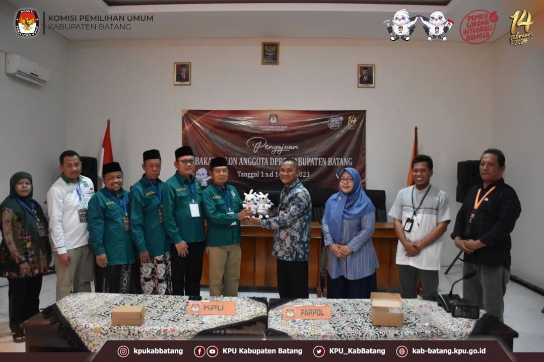Delegasi partai diterima oleh Ketua dan Anggota KPU Kabupaten Batang bersama Sekretaris KPU Kabupaten Batang serta disaksikan oleh Bawaslu Kabupaten Batang, bertempat di Aula KPU Kabupaten Batang.