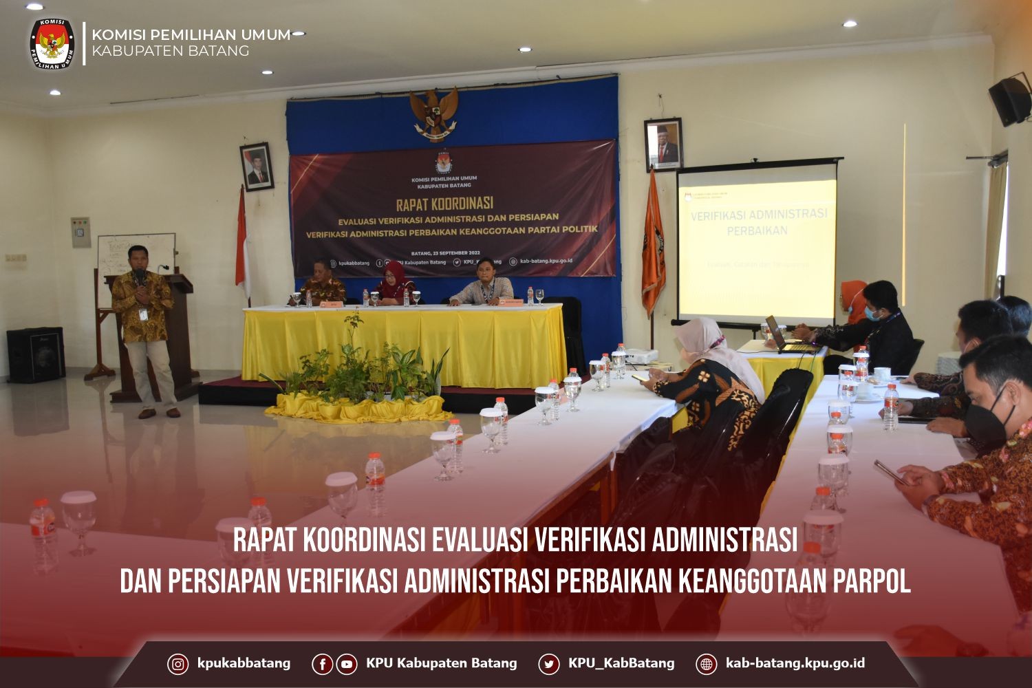 BATANG - KPU Kabupaten Batang menyelenggarakan Rapat Koordinasi Evaluasi Verifikasi Administrasi dan Persiapan Verifikasi Administrasi Perbaikan Keanggotaan Partai Politik pada hari Jumat, 23 September 2022 bertempat di Hotel Dewi Ratih Batang. Kegiatan ini dihadiri oleh Partai Politik calon peserta Pemilu 2024 di Kabupaten Batang, Bawaslu Kabupaten Batang dan Anggota Pokja Eksternal.