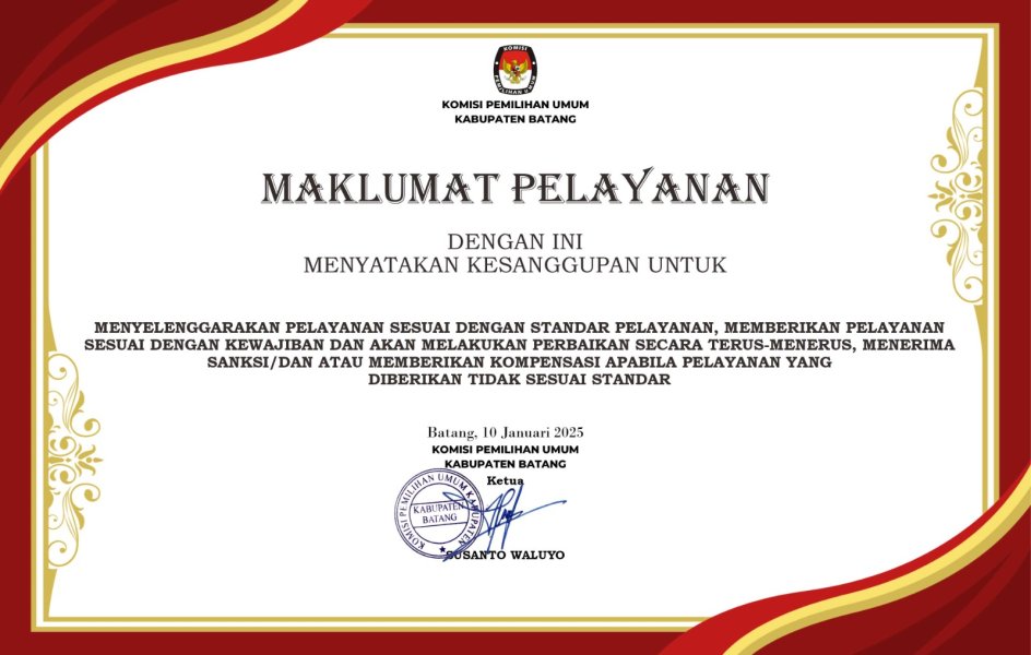 #TemanPemilih, KPU Kabupaten Batang telah menerbitkan Maklumat Pelayanan Menyelenggarakan Pelayanan Sesuai Dengan Standar Pelayanan, Memberikan Pelayanan Sesuai Dengan Kewajiban Dan Akan Melakukan Perbaikan Secara Terus-Menerus, Menerima Sanksi/Dan Atau Memberikan Kompensasi Apabila Pelayanan Yang Diberikan Tidak Sesuai Standar