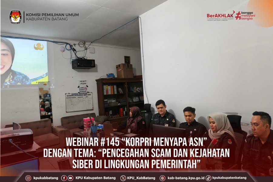 #TemanPemilih, Rabu (21 Januari 2026) KPU Kabupaten Batang mengikuti kegiatan Seri Webinar #145 “KORPRI MENYAPA ASN” dengan Tema: “Pencegahan Scam dan Kejahatan Siber di Lingkungan Pemerintah” secara daring melalui zoom.