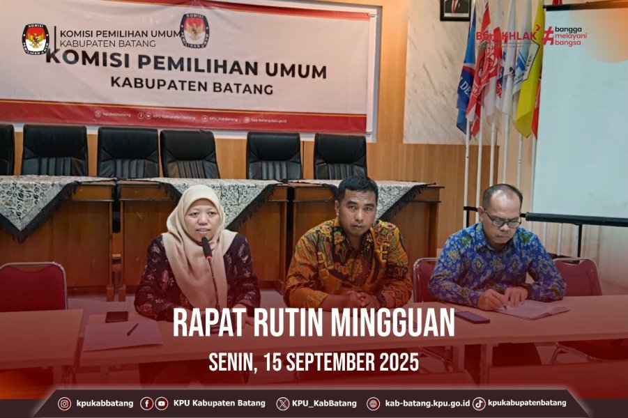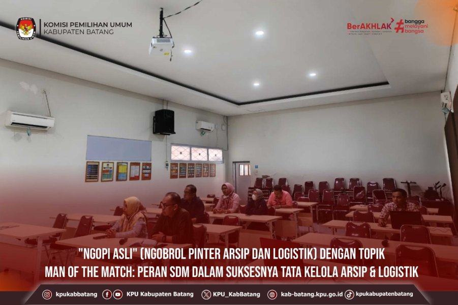 #TemanPemilih, Selasa (16 September 2025) KPU Kabupaten Batang mengikuti kegiatan "NGOPI ASLI" (Ngobrol Pinter Arsip dan Logistik dengan topik Man of the Match: Peran SDM dalam Suksesnya Tata Kelola Arsip & Logistik yang diadakan oleh KPU Provinsi Jawa Tengah. Kegiatan diikuti oleh jajaran Komisioner dan Sekretariat KPU Kabupaten Batang.