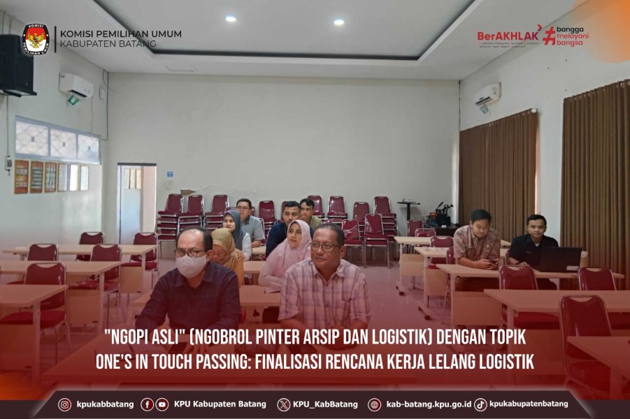 #TemanPemilih, Selasa (9 September 2025) KPU Kabupaten Batang mengikuti kegiatan "NGOPI ASLI" (Ngobrol Pinter Arsip dan Logistik dengan topik One's In Touch Passing: Finalisasi Rencana Kerja Lelang Logistik yang diadakan oleh KPU Provinsi Jawa Tengah. Kegiatan diikuti oleh jajaran Komisioner dan Sekretariat KPU Kabupaten Batang.