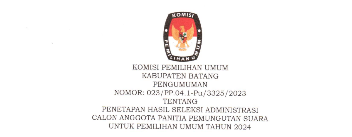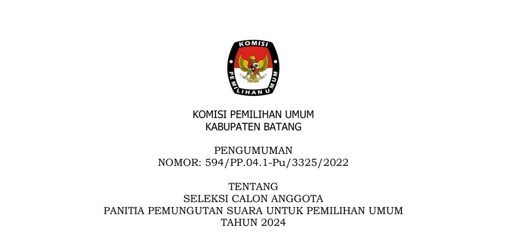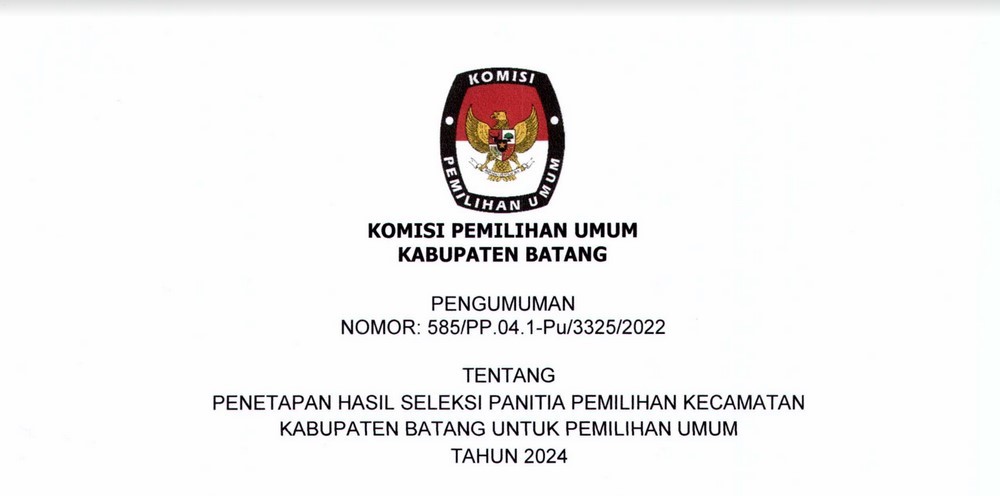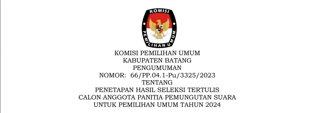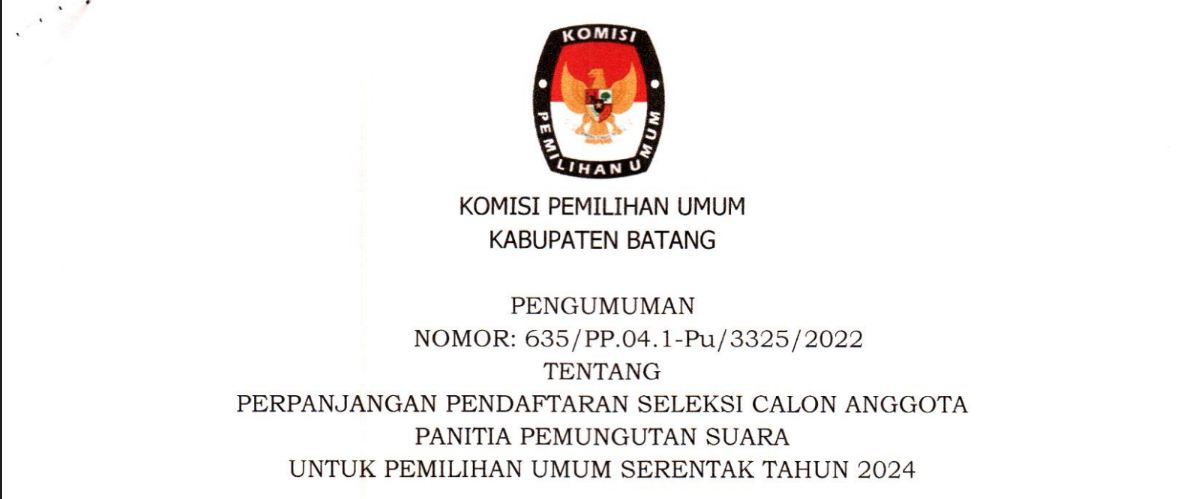 Pengumuman Penetapan Hasil Seleksi Panitia Pemilihan Kecamatan (PPK) Kabupaten Batang Untuk Pemilu 2024 Rabu, 14 Desember 2022 00:00 1382 . Unduh Pengumuman Penetapan Hasil Seleksi Panitia Pemilihan Kecamatan (PPK) Kabupaten Batang Untuk Pemilu 2024, Klik Disini Baca Selengkapnya