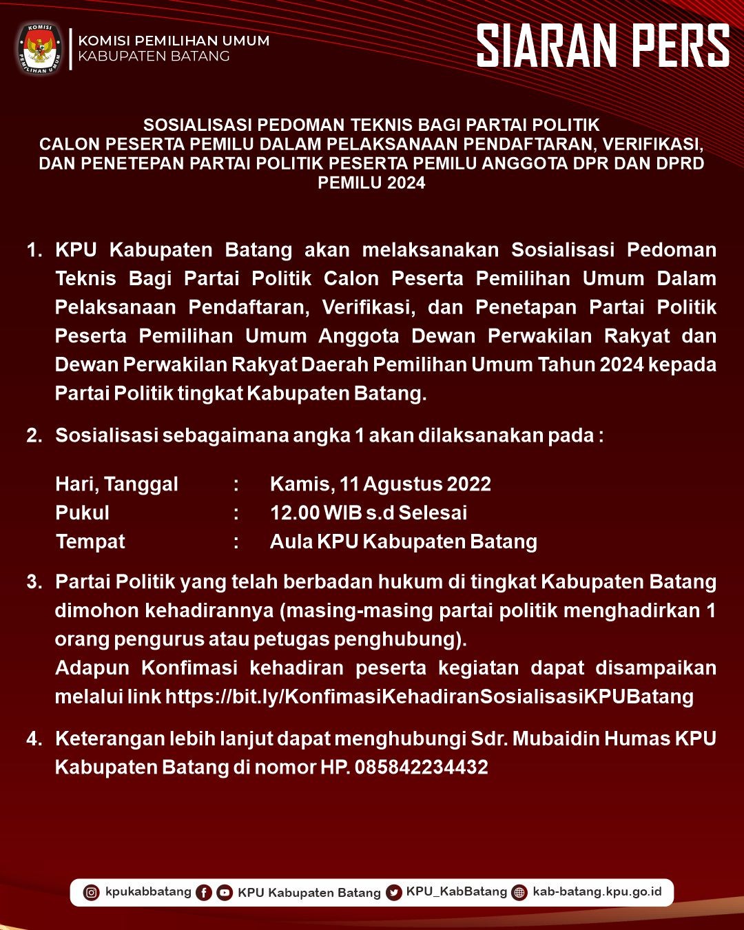 melalui email : tangmasbadanadhoc@gmail.com atau surat terbuka yang bisa disampaikan langsung ke kantor KPU Kabupaten Batang Jl. RA. Kartini No. 12 Batang