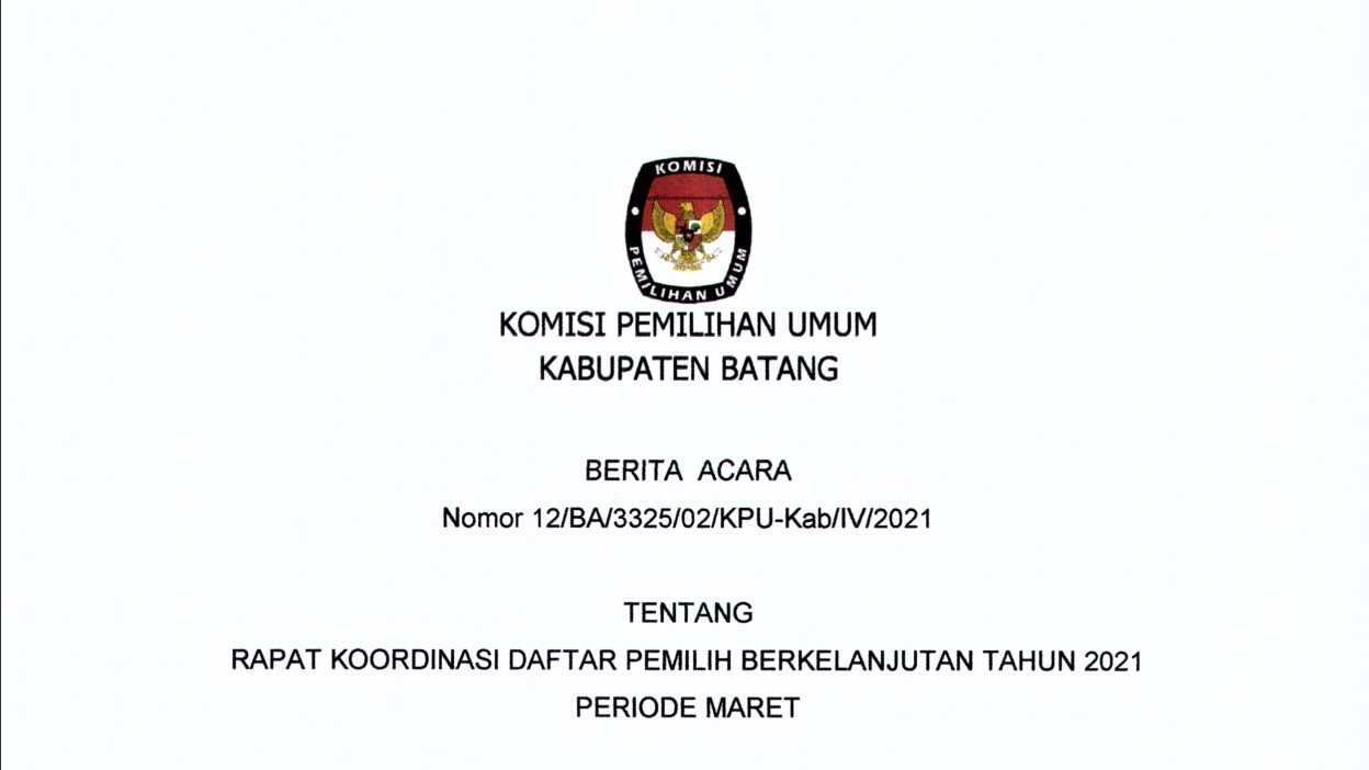 Berita Acara Nomor 12/BA/3325/02/KPU-Kab/IV/2021 tentang Rapat Koordinasi Daftar Pemilih Berkelanjutan Tahun 2021 Periode Maret selengkapnya klik disini