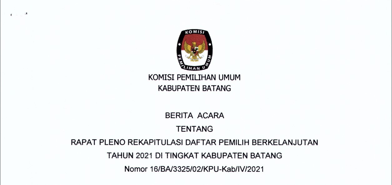 Berita Acara Tentang Rapat Pleno Rekapitulasi Daftar Pemilih Berkelanjutan Tahun 2021 Di Tingkat Kabupaten Batang Nomor 16/BA/3325/02/KPU-Kab/IV/2021 selengkapnya klik disini