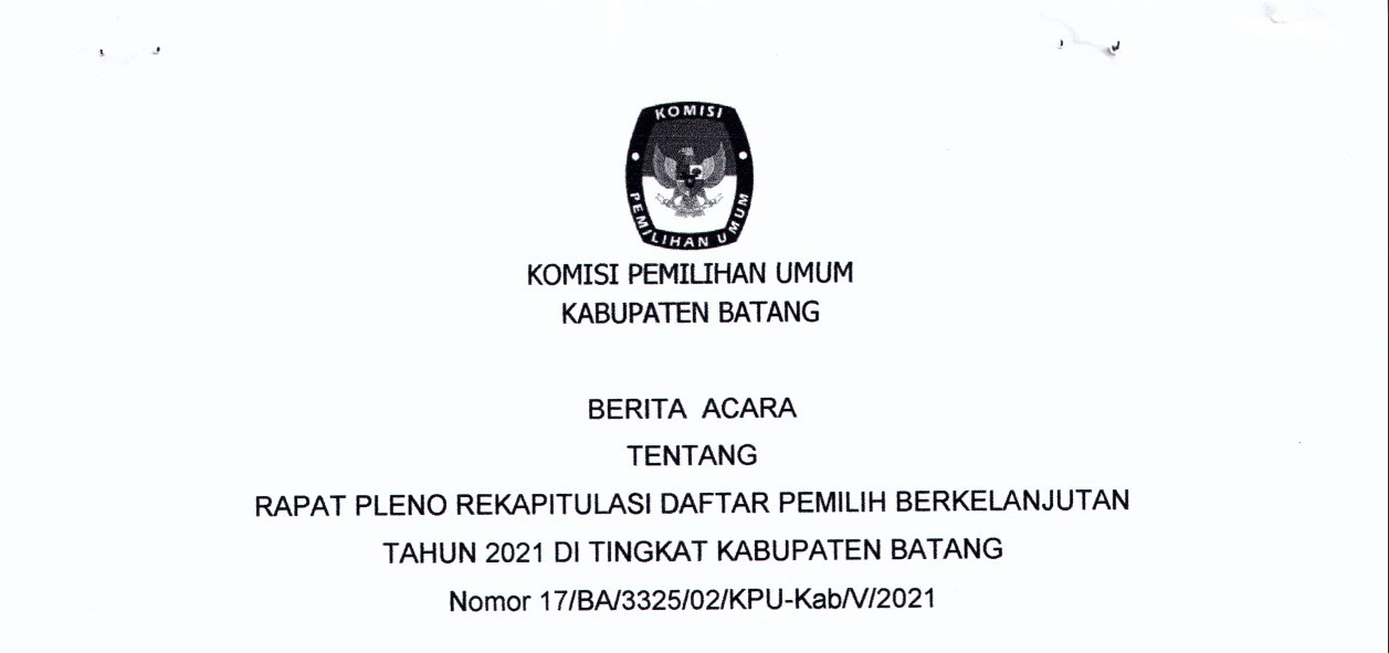 Berita Acara Tentang Rapat Pleno Rekapitulasi Daftar Pemilih Berkelanjutan Tahun 2021 Di Tingkat Kabupaten Batang Nomor 17/BA/3325/02/KPU-Kab/V/2021 selengkapnya klik disini