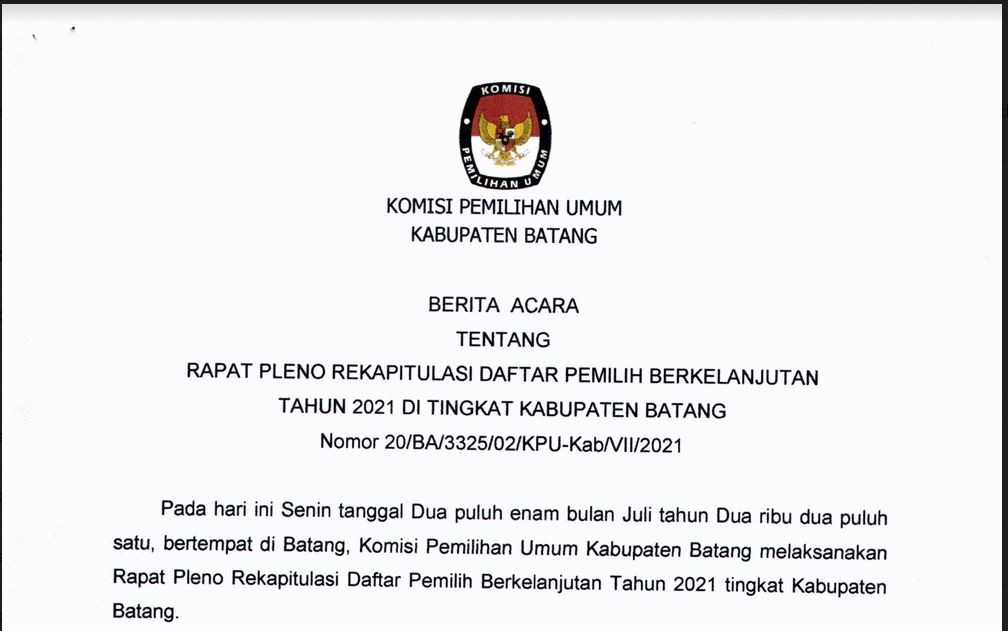 Berita Acara Tentang Rapat Pleno Rekapitulasi Daftar Pemilih Berkelanjutan Tahun 2021 Di Tingkat Kabupaten Batang Nomor 20/BA/3325/02/KPU-Kab/VII/2021 selengkapnya klik disini