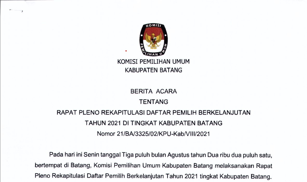 Berita Acara Tentang Rapat Pleno Rekapitulasi Daftar Pemilih Berkelanjutan Tahun 2021 Di Tingkat Kabupaten Batang Nomor 21/BA/3325/02/KPU-Kab/VIII/2021 selengkapnya klik disini