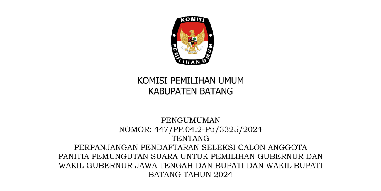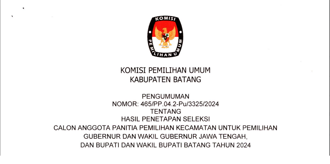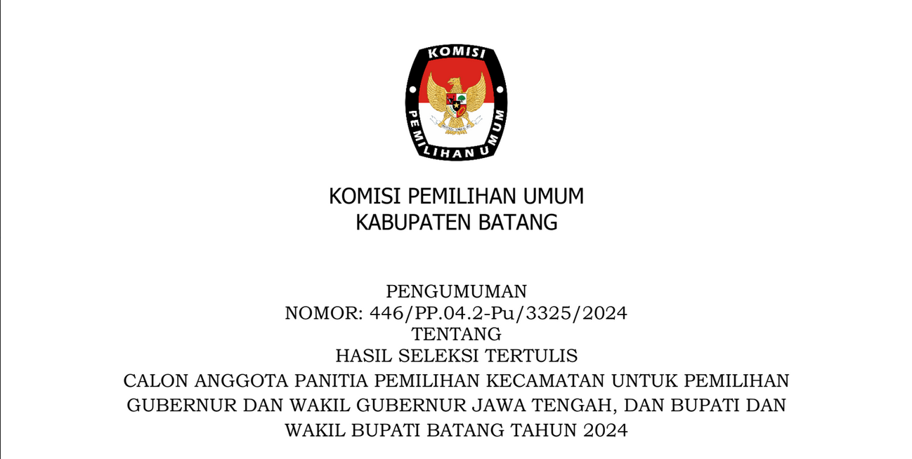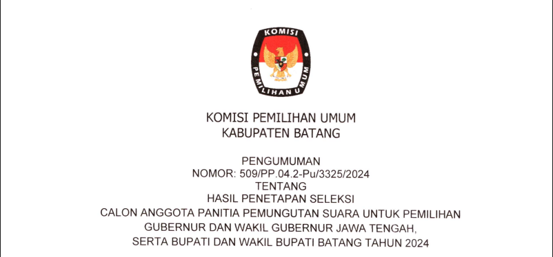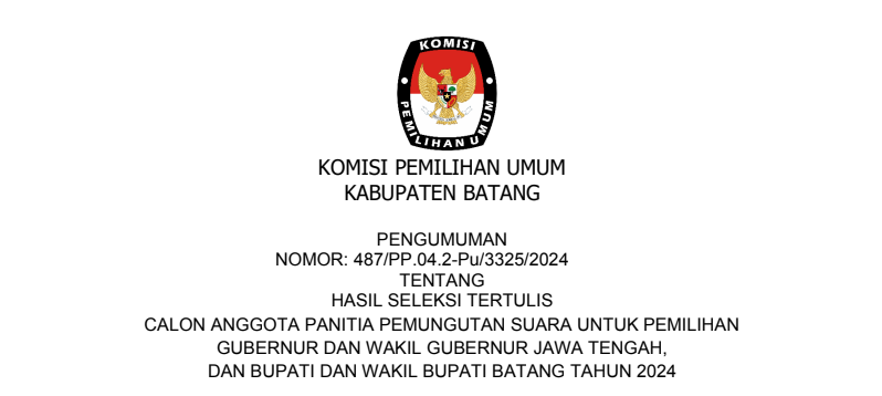 Pengumuman Nomor: 487/PP.04.2-Pu/3325/2024 Tentang Hasil Seleksi Tertulis Calon Anggota Panitia Pemungutan Suara Untuk Pemilihan Gubernur Dan Wakil Gubernur Jawa Tengah, Dan Bupati Dan Wakil Bupati Batang Tahun 2024, selengkapnya klik disini Komisi Pemilihan Umum Kabupaten Batang mengundang calon anggota Panitia Pemungutan Suara yang dinyatakan lulus untuk hadir dan mengikuti Seleksi Wawancara Calon Anggota Panitia Pemungutan Suara pada: Hari, Tanggal : Selasa s.d Kamis, 21 s.d 23 Mei 2024 Tempat : 15 Kecamatan Pakaian : Atasan Putih, Bawahan Hitam, Bersepatu Keterangan : Jadwal Lengkap Seleksi Wawancara bisa dilihat di masing-masing Kecamatan. Calon Anggota Panitia Pemungutan Suara yang mengikuti wawancara wajib membawa: a. Kartu Tanda Penduduk Elektronik b. Kartu Pendaftaran c. Alat Tulis Informasi lebih lanjut perihal pelaksanaan wawancara dapat disampaikan melalui Panitia Pemilihan Kecamatan (PPK) masing-masing Kecamatan.