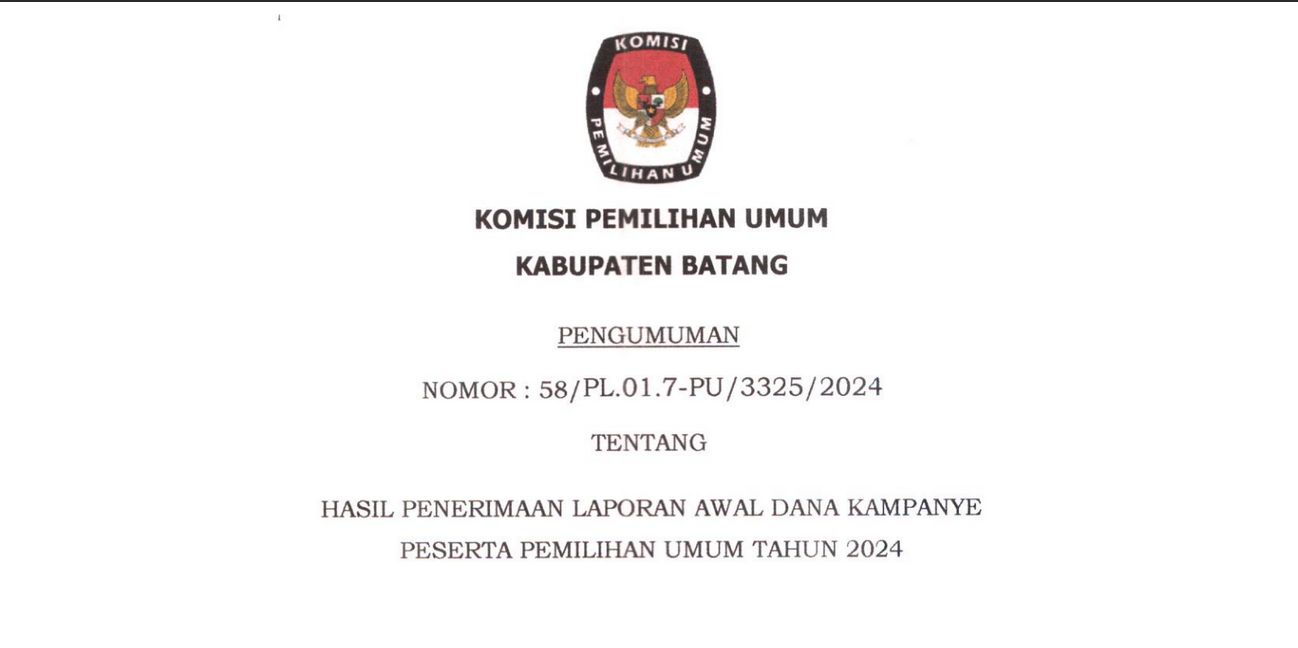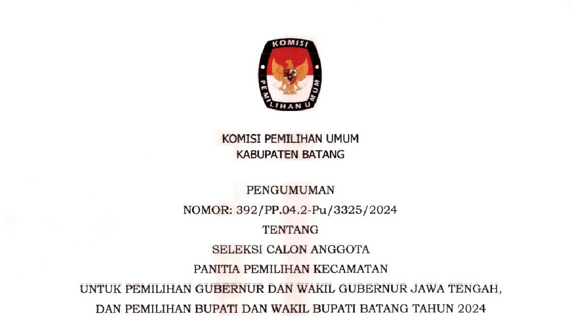 Pengumuman NOMOR: 392/PP.04.2-Pu/3325/2024 Tentang Seleksi Calon Anggota Panitia Pemilihan Kecamatan Untuk Pemilihan Gubernur Dan Wakil Gubernur Jawa Tengah, Dan Pemilihan Bupati Dan Wakil Bupati Batang Tahun 2024, selengkapnya klik disini