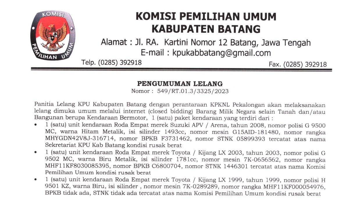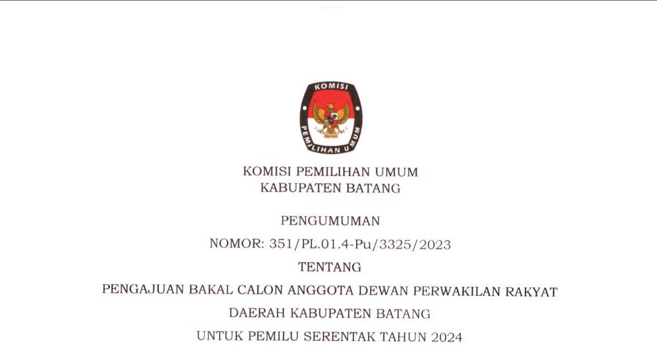 Delegasi partai diterima oleh Ketua dan Anggota KPU bersama Sekretaris KPU Kabupaten Batang serta disaksikan oleh Bawaslu, bertempat di Aula KPU Kabupaten Batang.